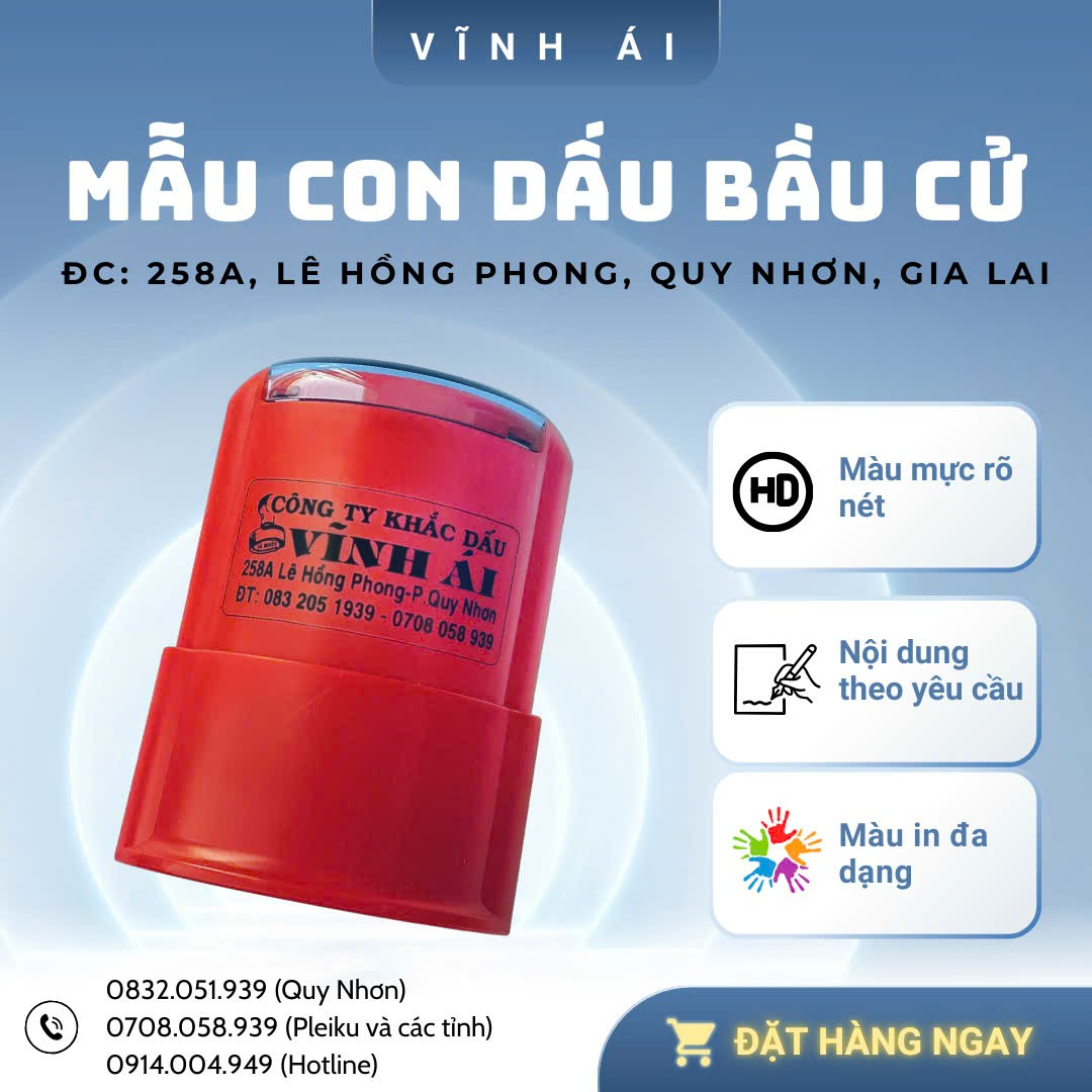 Cơ sở Con dấu Vĩnh Ái hiện có trụ sở kinh doanh tại đường Lê Hồng Phong, TP. Quy Nhơn, là địa chỉ quen thuộc và đáng tin cậy của nhiều cơ quan, đơn vị trong và ngoài khu vực. Với phương châm chất lượng – chính xác – uy tín, Vĩnh Ái cam kết mang đến các sản phẩm con dấu bầu cử đạt chuẩn, góp phần bảo đảm tính pháp lý, dân chủ và công bằng cho mỗi kỳ bầu cử.